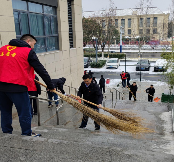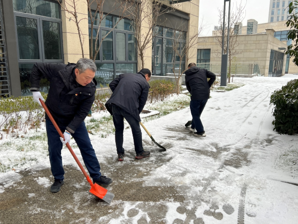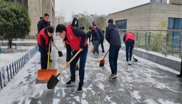 盡管寒意逼人,但大家個個不畏嚴(yán)寒、干勁十足,公司領(lǐng)導(dǎo)班子齊上陣,黨員干部充分發(fā)揮黨員示范帶頭作用,使用鐵鍬、掃帚等工具,不怕臟、不怕累、爭著鏟、搶著掃,將厚厚的積雪積冰清理干凈,道路上演奏著“咔咔嚓嚓”、“叮叮當(dāng)當(dāng)”的清雪除冰“進(jìn)行曲”,大家身穿志愿者馬甲,組成了冰雪天氣中靚麗的 “一抹紅”。經(jīng)過兩個小時的努力,園區(qū)的積雪積冰被全部清除,為園區(qū)過往路人的安全出行保駕護(hù)航。