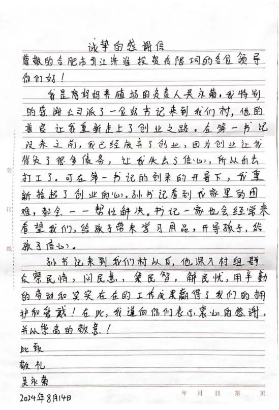 “孫書(shū)記看到我家里的困難,都會(huì)一一幫忙解決,孫書(shū)記用辛勤的勞動(dòng)和實(shí)實(shí)在在的工作贏得了我們的擁護(hù)和愛(ài)戴!”近日,長(zhǎng)豐縣莊墓鎮(zhèn)棗林社區(qū)村民吳永菊,在給公司第八批選派干部,時(shí)任棗林社區(qū)第一書(shū)記的孫玉同志的感謝信中這樣寫(xiě)道。她對(duì)市引江投資公司一直以來(lái)的關(guān)心幫助,和駐村書(shū)記孫玉同志三年以來(lái)的辛勤付出致以誠(chéng)摯的感謝,并為公司和孫玉同志送上印有“為民選派好領(lǐng)導(dǎo) 盡心盡力辦實(shí)事”“黨的好干部 群眾貼心人”的錦旗。
